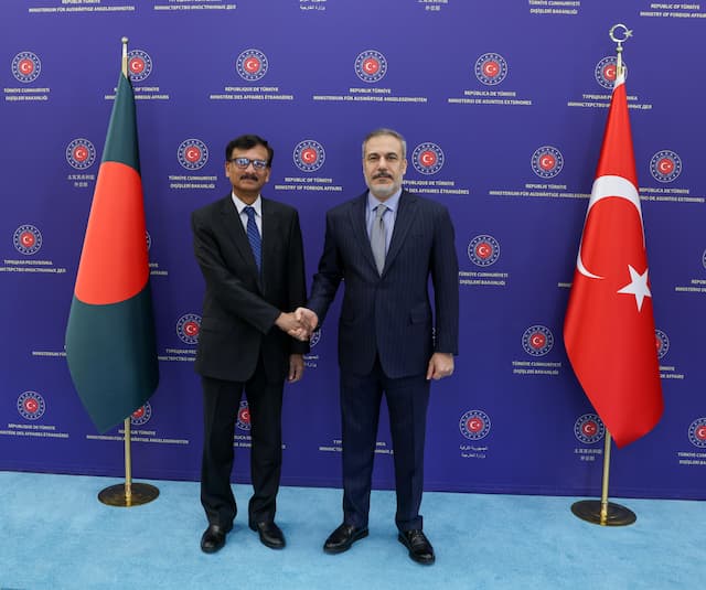 তুরস্কের পররাষ্ট্রমন্ত্রী হাকান ফিদানের সঙ্গে বৈঠক করেছেন বাংলাদেশের অন্তর্বর্তী সরকারের পররাষ্ট্র উপদেষ্টা তৌহিদ হোসেন। গত সোমবার (১৪ এপ্রিল) তুরস্কের রাজথানী আঙ্কারায় এ বৈঠক অনুষ্ঠিত হয়। বৈঠকে পররাষ্ট্র উপদেষ্টার সঙ্গে তথ্য ও সম্প্রচার উপদেষ্টা মো. মাহফুজ আলমও ছিলেন।