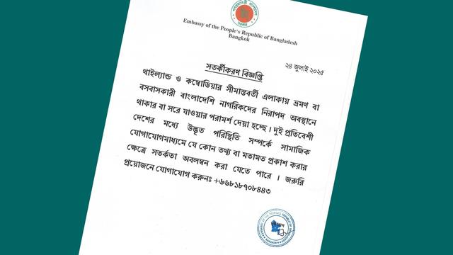 বিজ্ঞপ্তিতে বলা হয়, ‘থাইল্যান্ড ও কম্বোডিয়ার সীমান্তবর্তী এলাকায় ভ্রমণ বা বসবাসকারী বাংলাদেশি নাগরিকদের নিরাপদ অবস্থানে থাকার বা সরে যাওয়ার পরামর্শ দেওয়া হচ্ছে। দুই প্রতিবেশী দেশের মধ্যে উদ্ভূত পরিস্থিতি সম্পর্কে সামাজিক যোগাযোগমাধ্যমে যেকোনো তথ্য বা মতামত প্রকাশ করার ক্ষেত্রে সতর্কতা অবলম্বন করা যেতে পারে।’