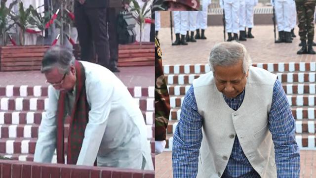 রাষ্ট্রপতি ও প্রধান উপদেষ্টা ১৯৭১ সালের মহান মুক্তিযুদ্ধের বীর শহীদদের স্মৃতির প্রতি গভীর শ্রদ্ধা জানিয়ে সেখানে কিছুক্ষণ নীরবে দাঁড়িয়ে থাকেন।