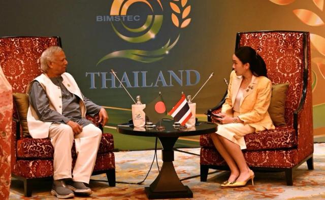 থাইল্যান্ডের রাজধানী ব্যাংককে অনুষ্ঠিত ষষ্ঠ বিমসটেক সম্মেলনের ফাঁকে প্রধান উপদেষ্টা অধ্যাপক মুহাম্মদ ইউনূস দেশটির প্রধানমন্ত্রী পেতংতার্ন সিনাওয়াত্রার সঙ্গে দ্বিপক্ষীয় বৈঠক করেছেন।
