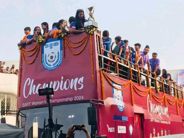 দুই বছর আগে ২০২২ সালেও সাফের শিরোপা জেতার পর ছাদখোলা বাসে নারী ফুটবলারদের অভ্যর্থনা জানিয়েছিল বাংলাদেশ। যে ছাদখোলা বাসে চড়ে মেয়েরা বিমানবন্দর থেকে বাফুফে ভবনে যান, রাজধানীতে বিভিন্ন স্থানে সেটা আবার সাজানো হয়েছিল সরকারের বিভিন্ন নেতাদের ছবি দিয়ে।