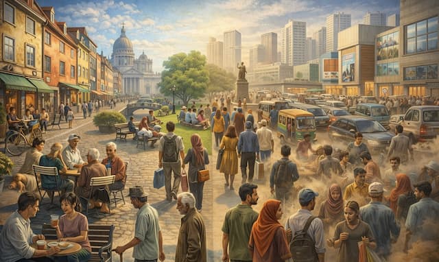 আবার ইউরোপের ঐতিহ্যবাহী শহর—স্টকহোম, প্যারিস, লন্ডন দেয় ভিন্ন অভিজ্ঞতা। রাস্তা পরিচ্ছন্ন, স্থাপত্য মনোরম, চত্বর ও বাগান সুসংগঠিত। মানুষ ধীরে হাঁটে, দৃশ্য উপভোগ করে। শহর সুন্দর, নিরাপদ, শৃঙ্খল—কিন্তু সামাজিক উপস্থিতি প্রায়ই পরিকল্পিত, কখনো পর্যটকনির্ভর। জীবন আছে, কিন্তু স্বতঃস্ফূর্ততার ঘনত্ব কম।