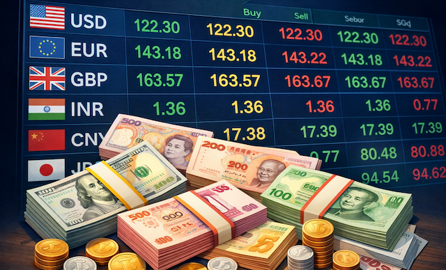 আমেরিকান ডলার—ক্রয় (টাকা) ১২২.৩০, বিক্রয় (টাকা) ১২২.৩০