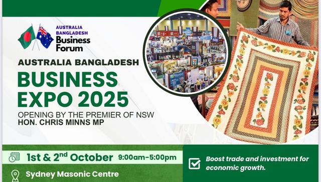 অস্ট্রেলিয়ার নিউ সাউথ ওয়েলথ রাজ্যের রাজধানী সিডনিতে আগামী ১ ও ২ অক্টোবর অনুষ্ঠিত হতে যাচ্ছে অস্ট্রেলিয়া-বাংলাদেশ বিজনেস এক্সপো ২০২৫।