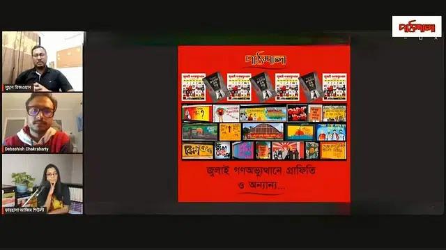 এবারের আলোচক ছিলেন বৈষম্যবিরোধী ছাত্র আন্দোলন ক্রমে গণ–অভ্যুত্থানে রূপ নেওয়ার পথে প্রত্যক্ষভাবে সম্পৃক্ত ও জুলাই গণ–অভ্যুত্থানের পোস্টারশিল্পী দেবাশিস চক্রবর্তী ও লেখক সুহান রিজওয়ান।