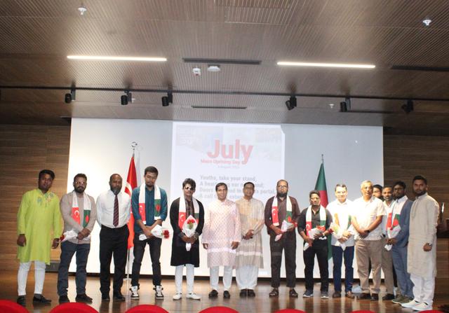আহত জুলাই যোদ্ধারা এবং দূতাবাসের কর্মকর্তা-কর্মচারীরা দূতাবাসের শহিদ মিনারে পুষ্পস্তবক অর্পণ করে জুলাই আন্দোলনে নিহতদের স্মরণ করেন।